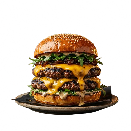 Double smash beef 200g, cheddar derretido cascata, molho da casa secreto, rúcula fresca & cebola caramelizada. Brioche tostado na manteiga.